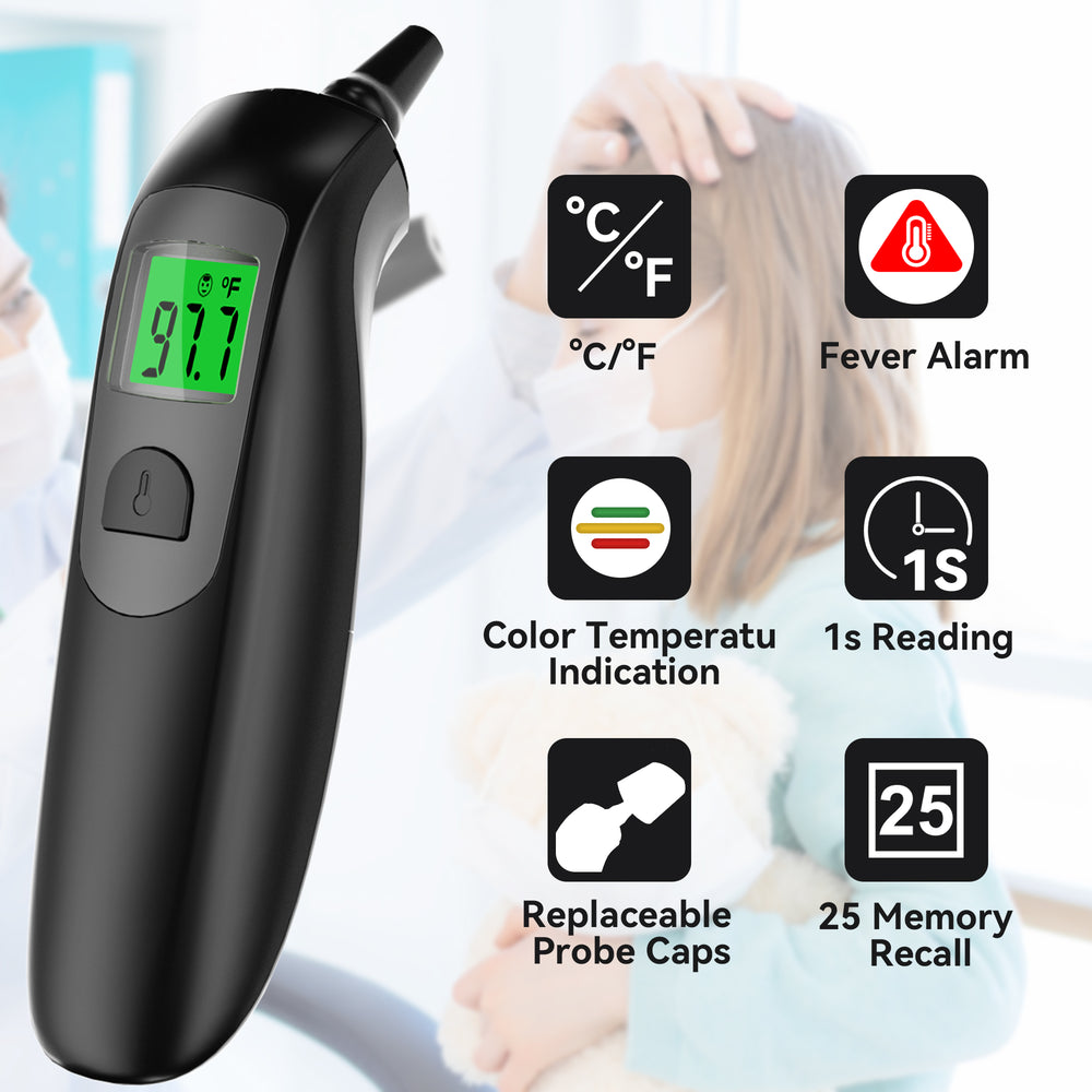 - Multiple Functions: Temporal thermometer comes with a high-temperature alarm system, that displays green, orange, or red to indicate high temperature, green for normal, orange for light high temperature, and red for high temperature. 25 sets of memories and easy to recall. Auto shut down and power saving