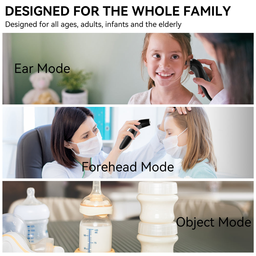ANKOVO forehead and ear thermometer for adults and babies&kids is equipped with the latest infrared technology, measures the temperature based on the infrared energy emitted from the eardrum or the forehead. You can quickly obtain the measurement results. ANKOVO digital thermometer take temperature less than 1 second, 1 button design to measure ear, forehead, room, milk, water and object temperature. And toggle switch Celsius and Fahrenheit. The thermometer has a non-slip design, and LCD display is clear and easy to read, the display can be used at night without in the light.